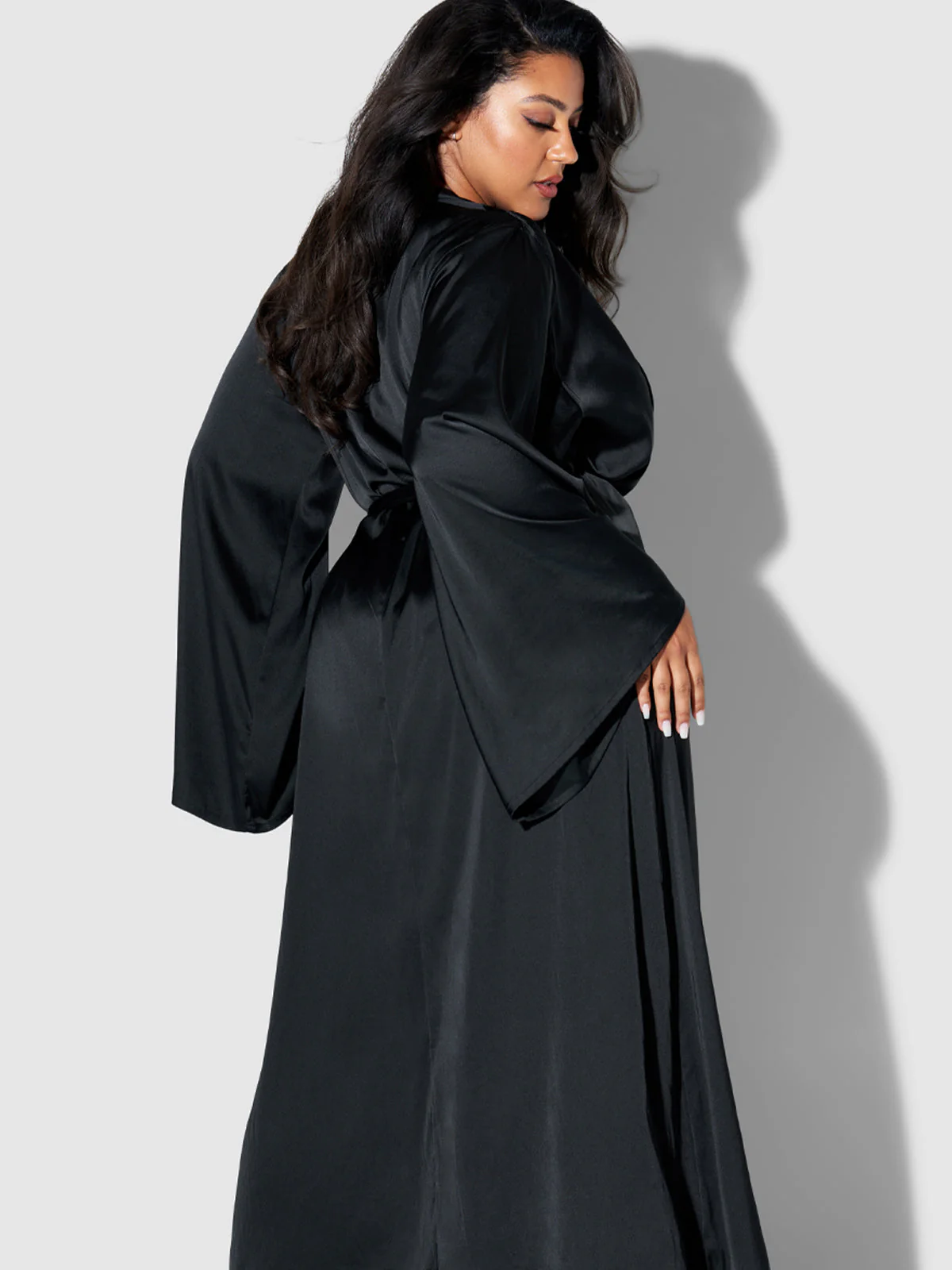 A dramatic full robe features a long flowing hemline and generous sleeves. The robe is crafted from luxuriously silky fabric. Wear solo or layered over your favorite Petra pieces for a luxe lingerie look.